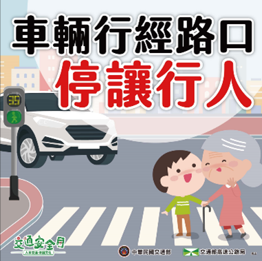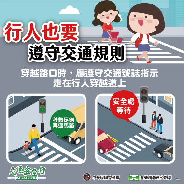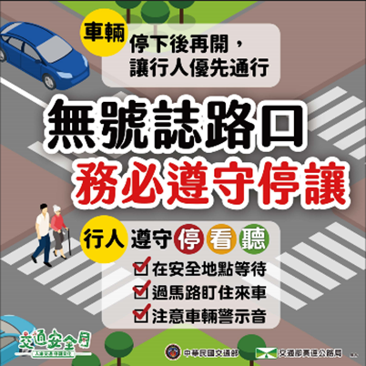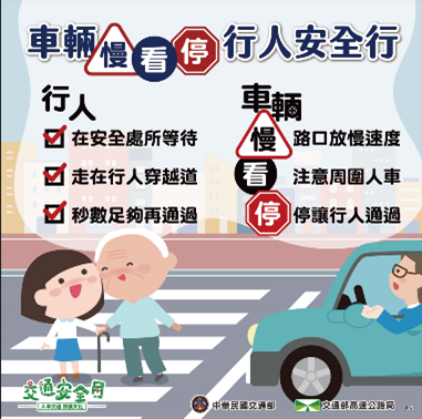 車輛行經路口停讓行、行人穿越路口遵守交通規則,秒數足夠再過馬路,更不要邊看手機;無號誌路口,務必遵守「停」、「讓」標誌。